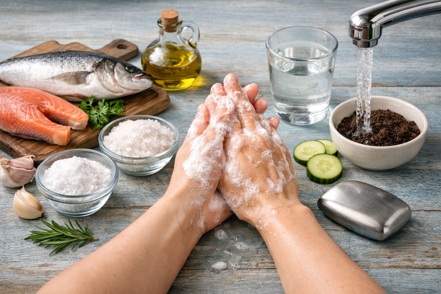 Balık kestikten sonra ellerinizi yıkarken yapılan en büyük hata sıcak su kullanmaktır. Yüksek sıcaklık gözenekleri genişleterek yağ ve koku parçacıklarının epidermise daha derin nüfuz etmesine olanak tanır. Temizliğe her zaman yalnızca ile başlayın soğuk suve ancak ana kirliliği giderdikten sonra sıcak banyolara veya nemlendirici kremlere geçebilirsiniz.